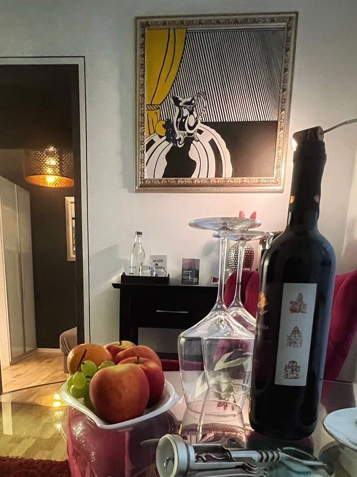 Sie übernachten in einem individuell gestalteten Doppelzimmer. Zur Begrüßung stehen Obst und Pralinen sowie eine Flasche Rotwein für Sie bereit.